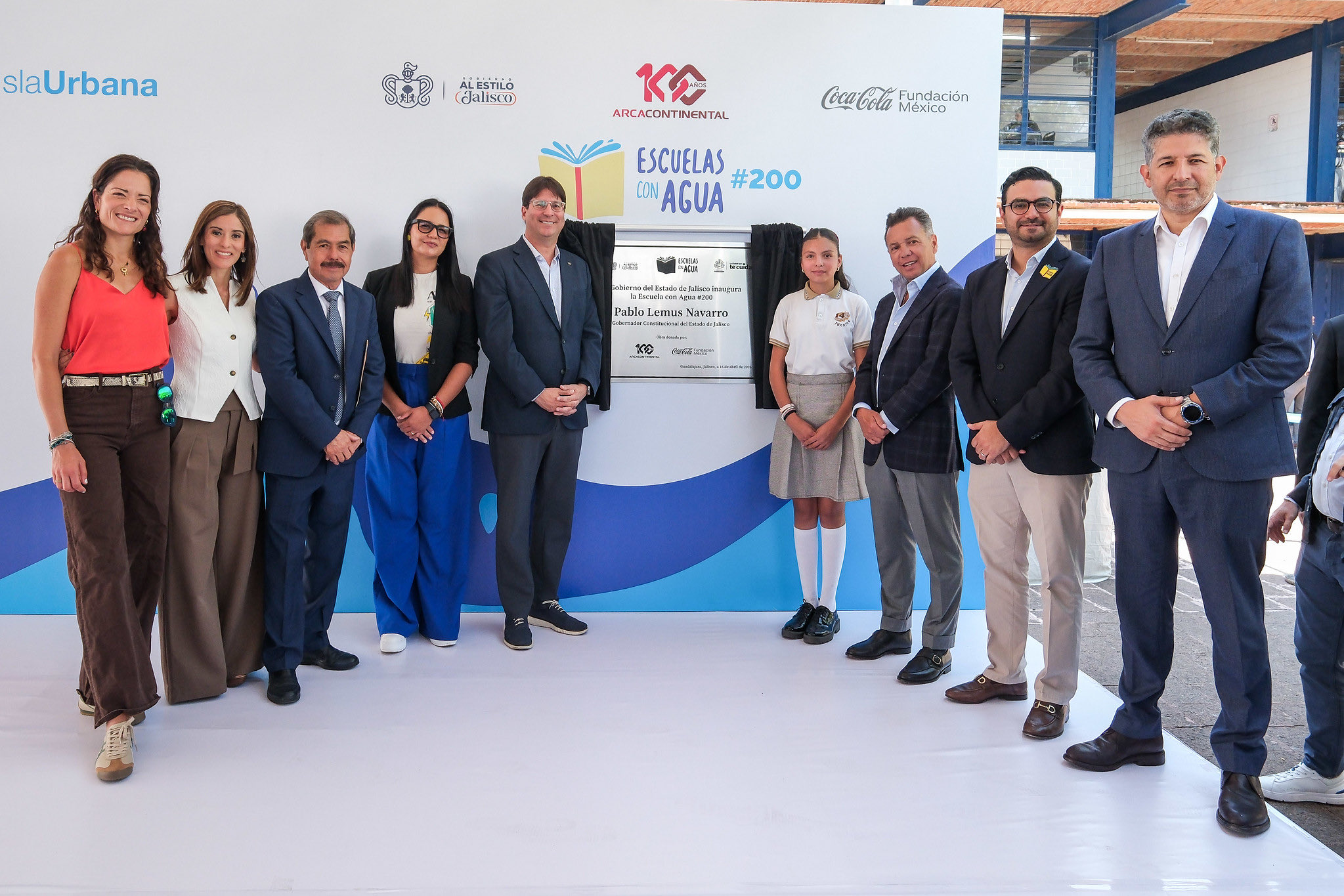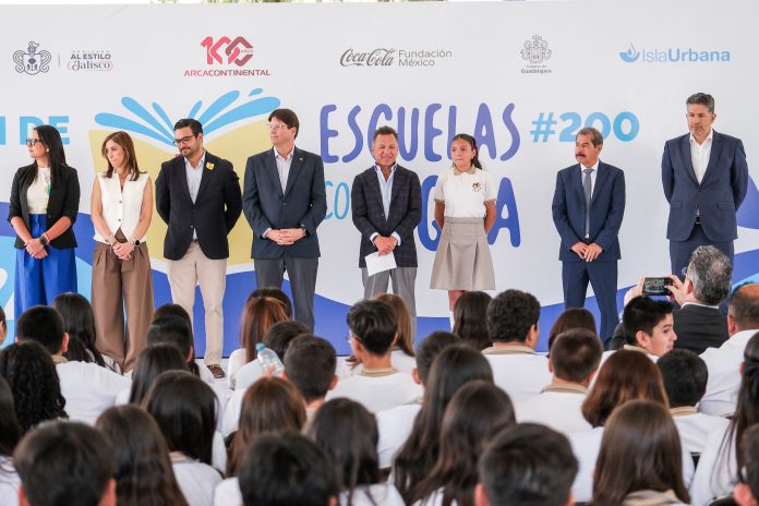 Jalisco.- Con el objetivo de fortalecer el trabajo conjunto que garantice el acceso al agua y promueva una cultura de uso responsable, Pablo Lemus Navarro, Gobernador del Estado, celebró la instalación del sistema de captación de agua pluvial número 200, a nivel nacional, del programa “Escuelas con Agua”, impulsado por Arca Continental y Fundación Coca-Cola México.