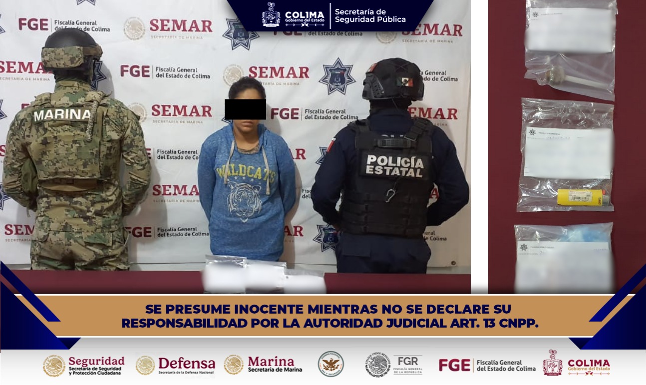 COLIMA.- La Secretaría de Seguridad Pública del Gobierno del Estado de Colima informó que, como parte de los operativos coordinados con autoridades federales, estatales y municipales, se realizaron recientes patrullajes preventivos en el municipio de Colima, donde se detuvo a una mujer por su probable participación en delitos contra la salud.
