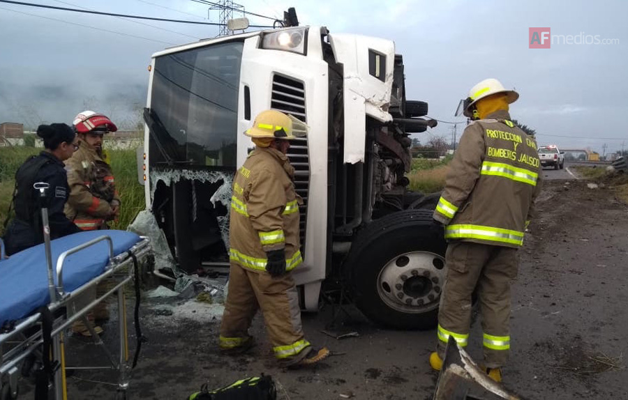 Jalisco.- Personal de la Unidad Estatal de Protección Civil y Bomberos Jalisco atendieron la volcadura de un vehículo de la empresa Alipu, sobre el municipio de Poncitlán.