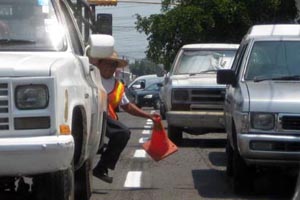 Colima.- Vaya peculiar forma de recoger los conos por parte de trabajadores del Ayuntamiento de Colima, que le dieron una manita de gato a la señalización de vialidades de la capital.