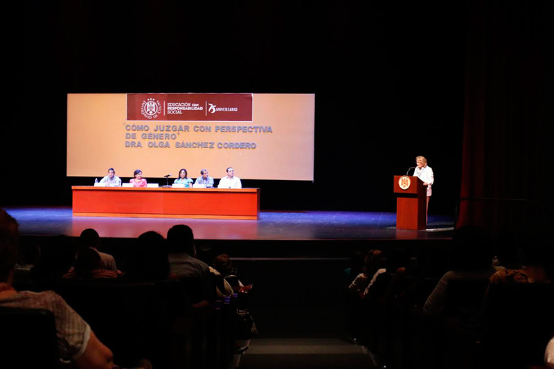 “Juzgar con perspectiva de género no es exclusivo para las mujeres; por el contrario, consiste en hacer visibles las diferencias generadas por el sistema de justicia basado en estereotipos construidos por la sociedad”, señaló la ministra Olga Sánchez Cordero en su conferencia “El protocolo para juzgar con perspectiva de género, haciendo realidad el derecho a la igualdad”, que dictó en el Teatro Universitario.