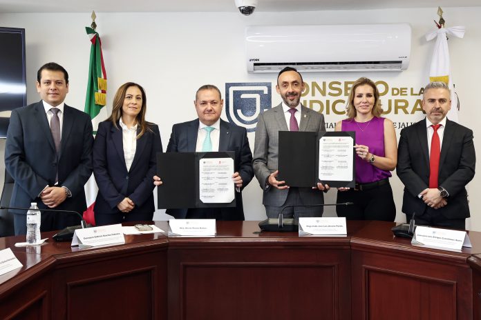 JALISCO.- Con el propósito de fortalecer la colaboración institucional y ampliar la capacitación jurídica en beneficio del servicio público, el Consejo de la Judicatura del Estado de Jalisco (CJJ) y la Procuraduría Social del Gobierno del Estado firmaron un convenio de colaboración orientado al desarrollo de actividades conjuntas de formación y actualización profesional.