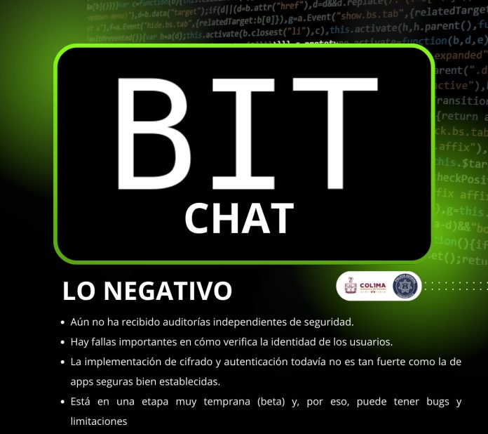 COLIMA.- La Policía Cibernética de la Secretaría de Seguridad del Estado de Colima emitió información oficial para alertar a la población sobre el funcionamiento y los posibles riesgos de la aplicación de mensajería BitChat, una plataforma tecnológica que permite enviar mensajes entre dispositivos sin necesidad de conexión a internet, Wi-Fi o datos móviles.