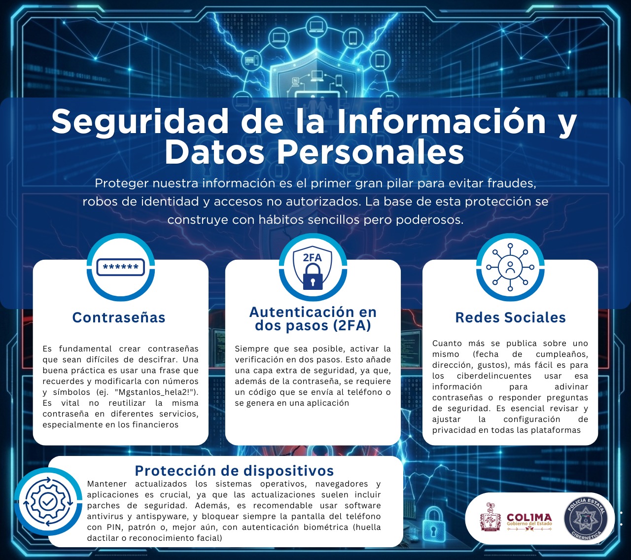 COLIMA.- La Secretaría de Seguridad y Protección Ciudadana de Colima, a través de su Policía Cibernética, emitió una serie de recomendaciones dirigidas a la ciudadanía para fortalecer la seguridad de la información personal en entornos digitales y prevenir delitos como fraudes, robo de identidad y accesos no autorizados a cuentas.
