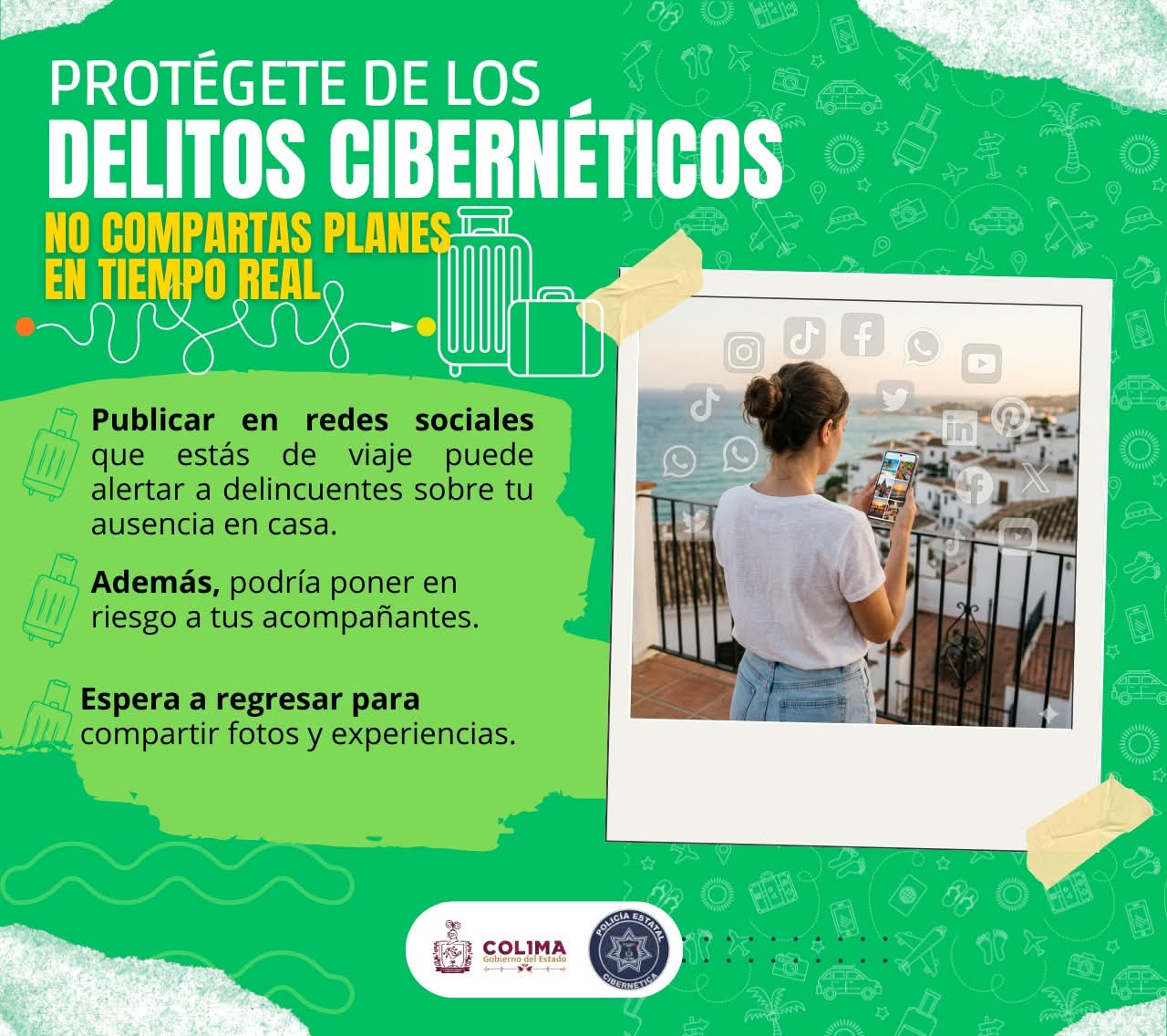 En ese sentido, la autoridad recomendó compartir fotografías, ubicaciones o experiencias de viaje hasta después de regresar al hogar, como una medida de prevención que reduce la posibilidad de ser víctima de algún delito.