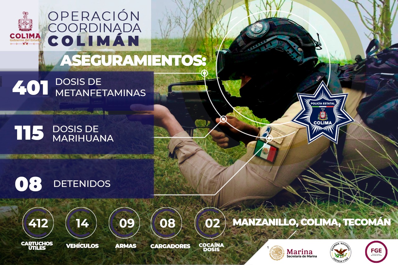COLIMA.- La Secretaría de Seguridad Pública (SSP) del Gobierno del Estado de Colima informa que derivado de las acciones de la Operación Coordinada ‘Colimán’, la Policía Estatal Preventiva (PEP) detuvo a ocho personas y logró el aseguramiento de 401 dosis de metanfetaminas y 115 dosis de marihuana, en los municipios de Manzanillo, Tecomán y Colima.