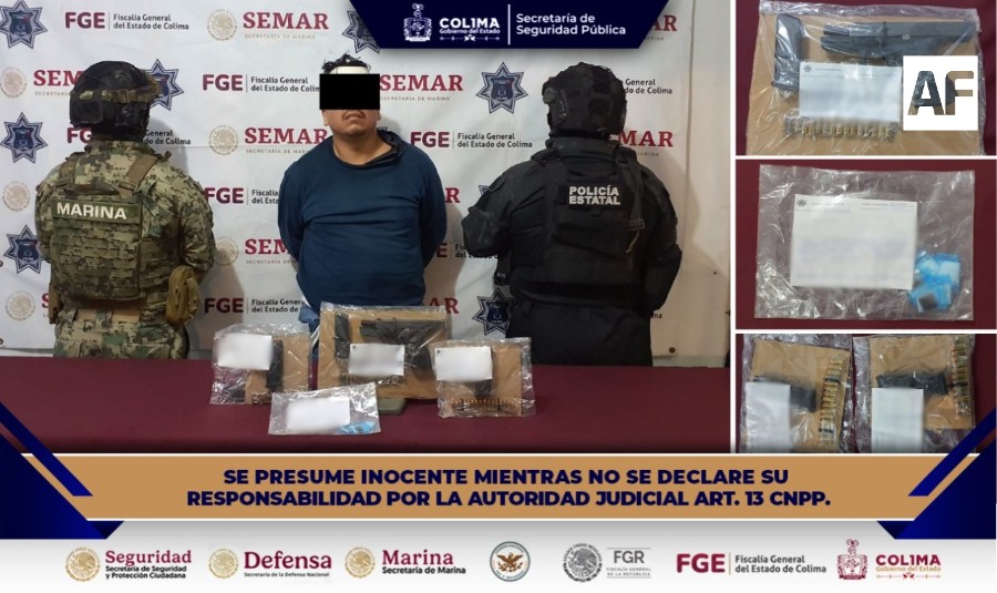 Colima.- La Secretaría de Seguridad Pública (SSP) del Gobierno del Estado de Colima, informa que la Policía Estatal Preventiva (PEP), en coordinación con elementos operativos de la Secretaría de Marina Armada de México (Semar), detuvieron a un masculino por los delitos de robo, robo de vehículo, delitos contra la salud y violación a la Ley Federal de Armas de Fuego y Explosivos, en hecho ocurrido en esta ciudad capital.
