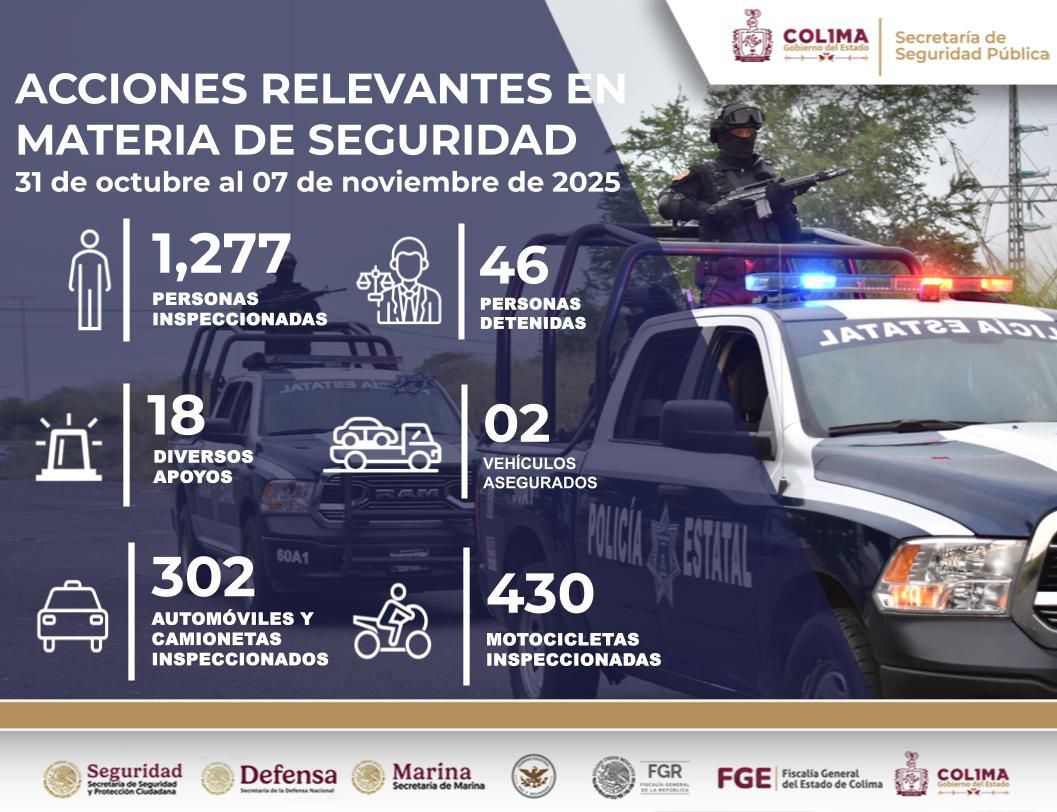 Además de la detención de estas 46 personas en distintos hechos por presunta participación en delitos contra la salud, violencia familiar, amenazas, daños y diversas faltas administrativas, ocurridas en el estado de Colima, se destacaron algunas otras acciones en este mismo periodo, se inspeccionaron a mil 277 personas, 302 vehículos y 430 motocicletas.