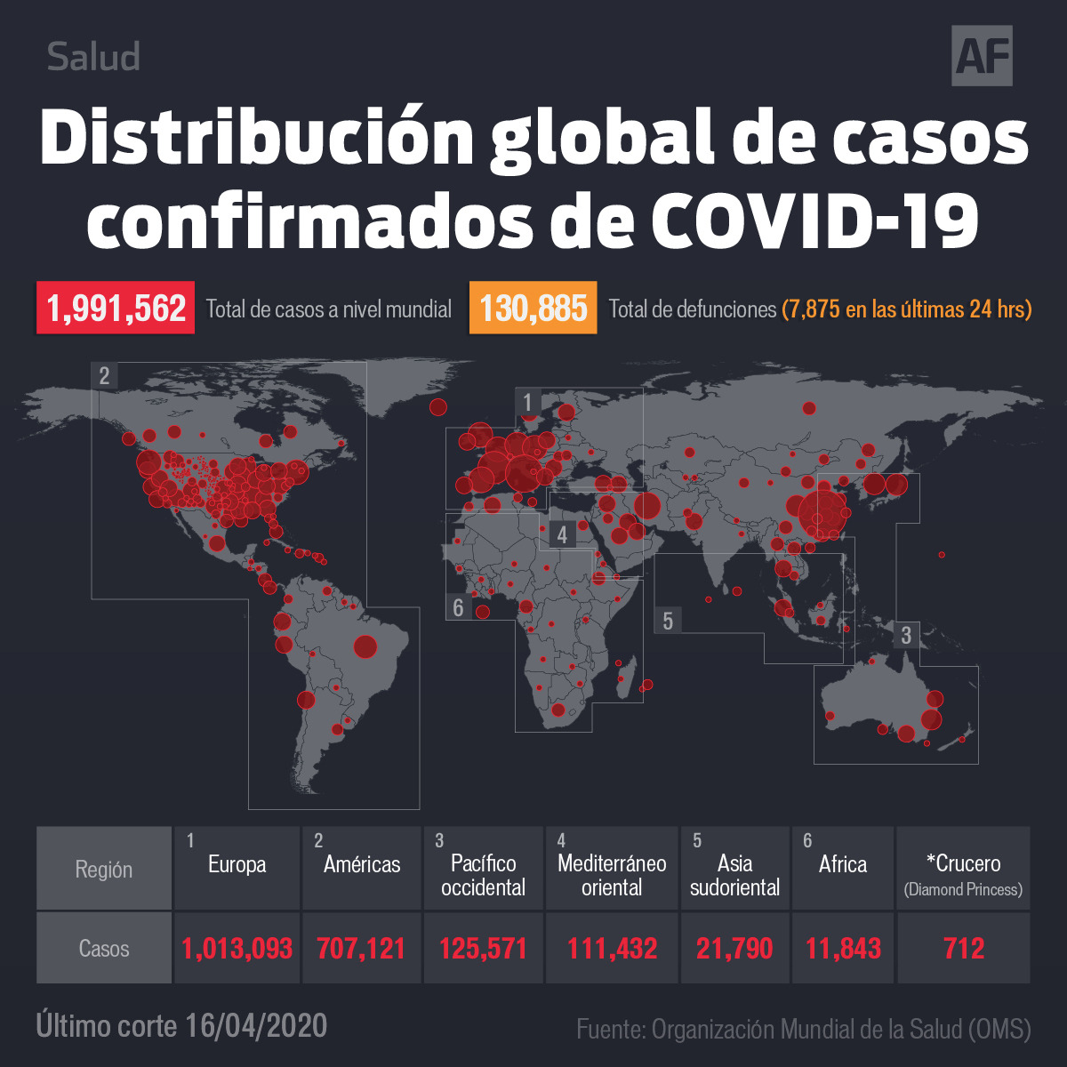 La Organización Mundial de la Salud apuntó que, a nivel mundial, los contagios de COVID-19 llegaron al millón 991 mil 562, con 76 mil 647 nuevos contagios en las últimas 24 horas y las muertes alcanzaron las 130 mil 885, con 7 mil 875 desde el conteo de ayer.