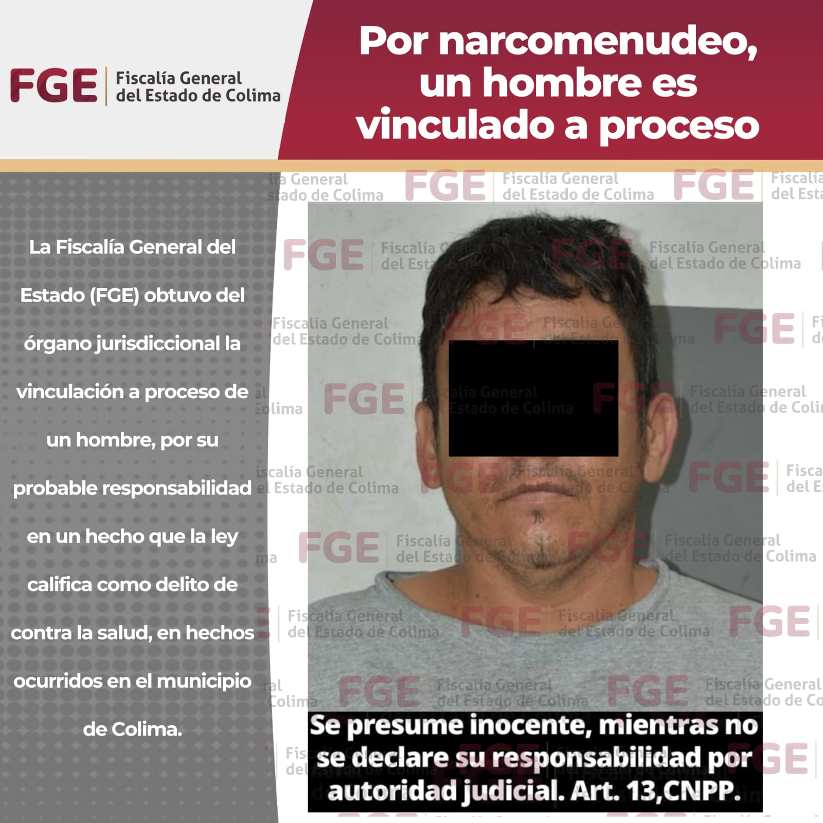 COLIMA.- La Fiscalía General del Estado (FGE) obtuvo del órgano jurisdiccional la vinculación a proceso de un hombre, por su probable responsabilidad en un hecho que la ley califica como delito de contra la salud, en hechos ocurridos en el municipio de Colima.