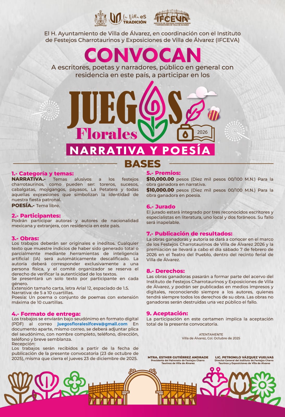 VILLA DE ÁLVAREZ.- La Presidenta Tey Gutiérrez Andrade presentó la Convocatoria de los Juegos Florales Narrativa y Poesía 2026, que en el marco de la edición 169 de los Festejos Charro Taurinos de Villa de Álvarez invita a participar a personas escritoras, narradoras, poetas y público en general.