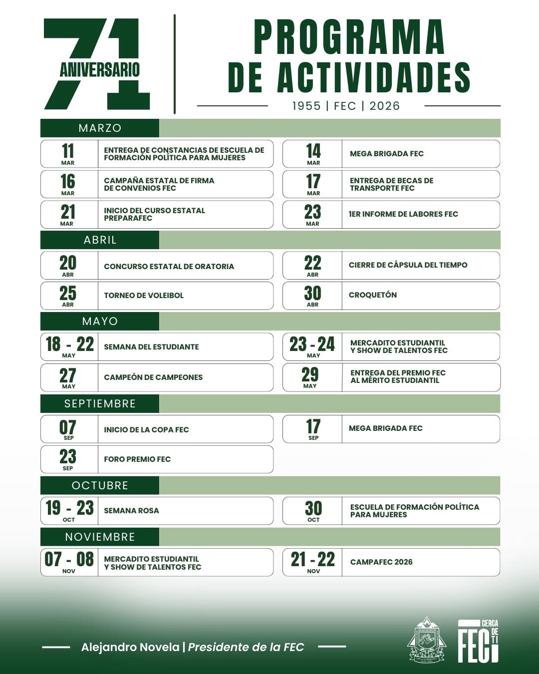 COLIMA. – La Federación de Estudiantes Colimenses (FEC), organismo representativo de la comunidad estudiantil de la Universidad de Colima, anunció formalmente el inicio de las festividades por su 71° Aniversario. A través de sus canales oficiales, la organización dio a conocer una extensa agenda que busca conmemorar más de siete décadas de trayectoria en la entidad.