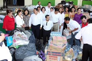 Colima.- En un acto realizado en el DIF Estatal Colima y que fue encabezado por la presidenta de este organismo, Alma Delia Arreola de Anguiano, así como por el dirigente del PRI en la entidad, Martín Flores Castañeda, los priistas hicieron entrega de una tonelada de víveres, ropa y distintos artículos que se recabaron para apoyar a los damnificados por el huracán Jova.
