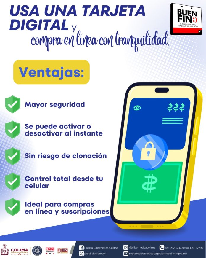 COLIMA.- La Policía Cibernética de la Secretaría de Seguridad del Estado de Colima emitió una serie de recomendaciones para fomentar el uso de tarjetas digitales como una herramienta eficaz para proteger el dinero de la ciudadanía y prevenir fraudes en compras en línea.