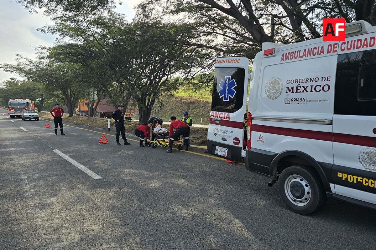 CUAUHTÉMOC.- Personal de Protección Civil y Bomberos del municipio de Cuauhtémoc atendió un accidente vehicular con volcadura registrado en el kilómetro 133+700 de la autopista Colima–Guadalajara, donde un hombre de 33 años resultó lesionado y fue trasladado a un hospital para recibir atención médica especializada. Las autoridades informaron que el incidente generó movilización de diversas corporaciones debido a la ubicación y condiciones del siniestro.