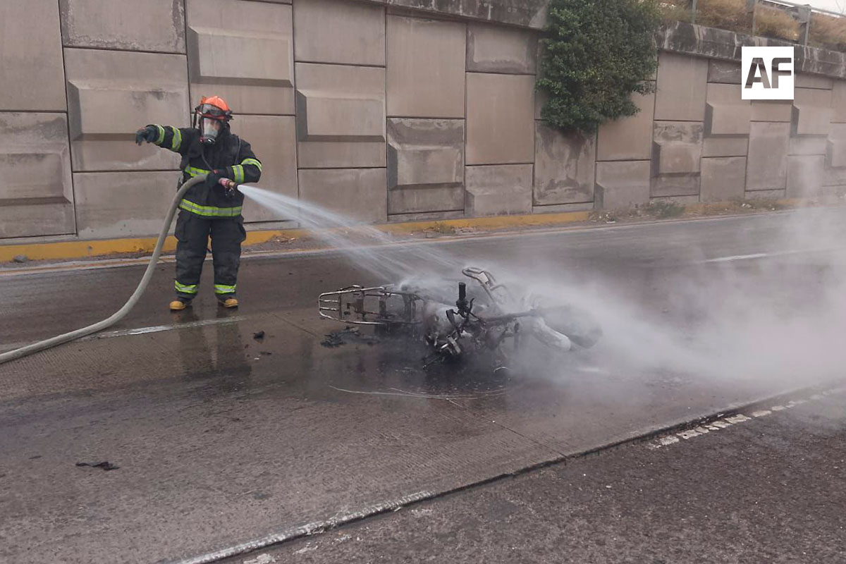 «El reporte fue realizado por la Policía Estatal Preventiva (PEP), que solicitó apoyo tras detectarse que la motocicleta se incendiaba en el carril con sentido de norte a sur.»