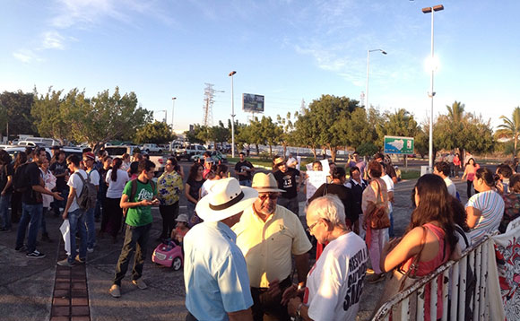 Colima.- Un grupo de manifestantes se congregó afuera del Complejo Administrativo del Gobierno del Estado, minutos antes de que el gobernador Mario Anguiano Moreno dirija un mensaje con motivo de su quinto informe de gobierno.
