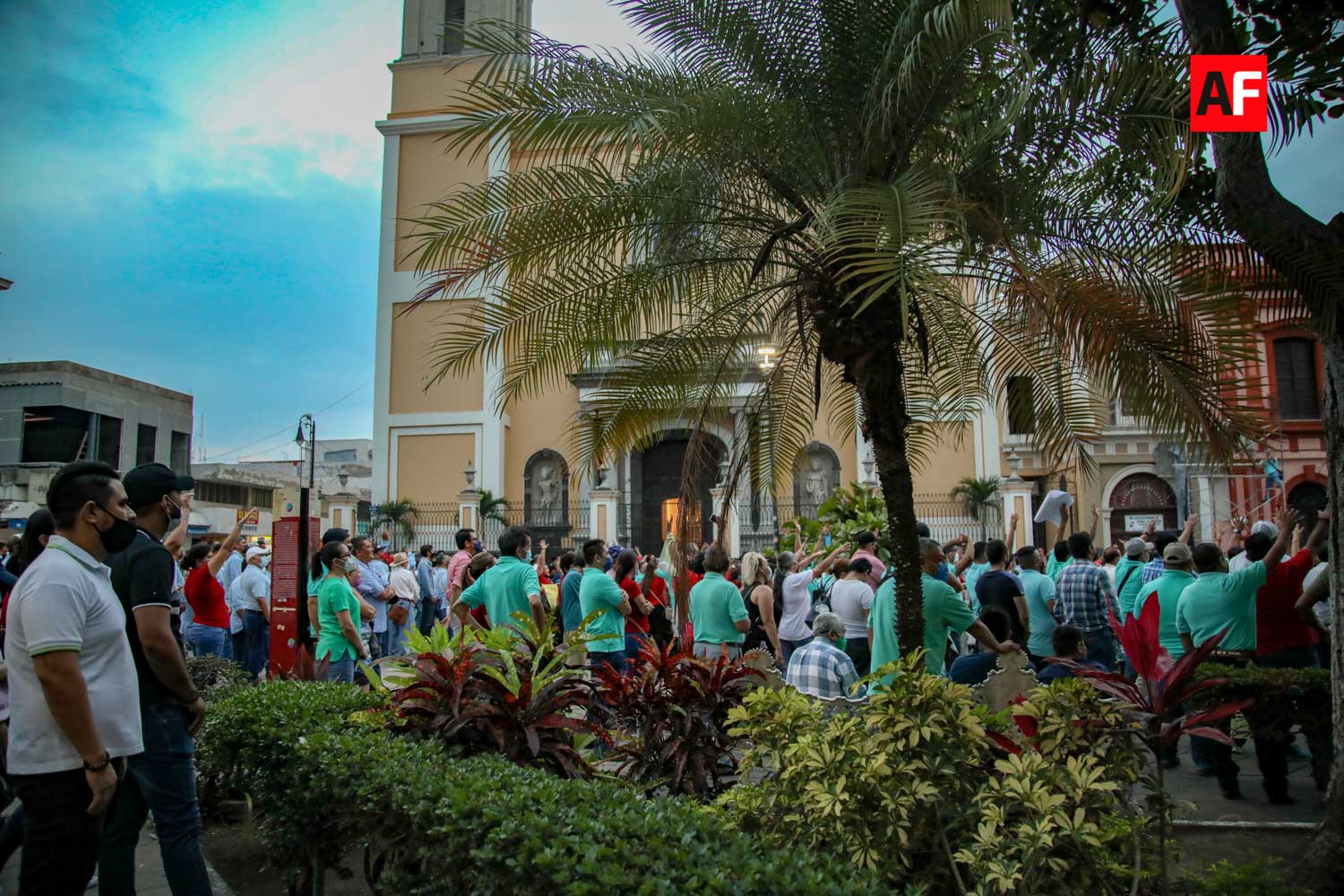Los contingentes vestidos con camisa verde comenzaron a llenar la plancha de la plaza Libertad y a levantar decenas de pancartas contra el gobernador José Ignacio Peralta Sánchez.