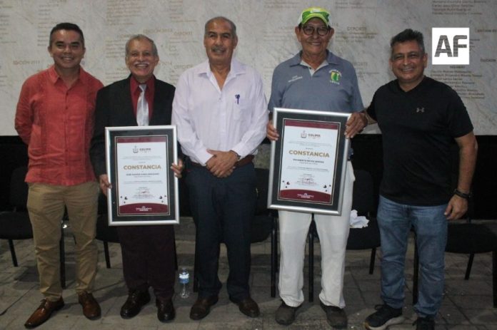 Colima.- En representación de la gobernadora Indira Vizcaíno Silva, el secretario de Educación y Cultura del Gobierno del Estado de Colima, Adolfo Núñez González develó los nombres de los ex futbolistas José Ramón Cano Anguiano y Rigoberto Reyes Zepeda, los cuales fueron inscritos con letras doradas en el Muro de Honor del Deporte Colimense.