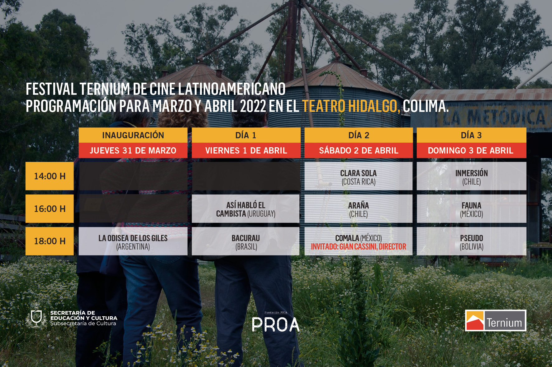 COLIMA.- Del 31 de marzo al 3 de abril, se llevará a cabo la novena edición del Festival Ternium de Cine Latinoamericano en Colima, auspiciado por Ternium y Fundación PROA, en colaboración con la Subsecretaría de Cultura del Gobierno del Estado de Colima. Esta muestra cinematográfica será en el Teatro Hidalgo y estará abierta al público de forma gratuita.