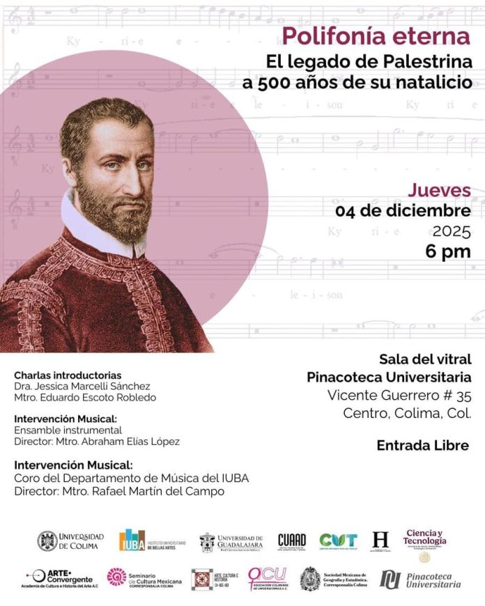 Este jueves 4 de diciembre, a las 6 de la tarde, la Sala del Vitral de la Pinacoteca Universitaria será sede del homenaje “Polifonía eterna: El legado de Palestrina a 500 años de su natalicio”, un encuentro académico y musical dedicado a celebrar la obra de Giovanni Pierluigi da Palestrina, uno de los más influyentes compositores de la música sacra renacentista.