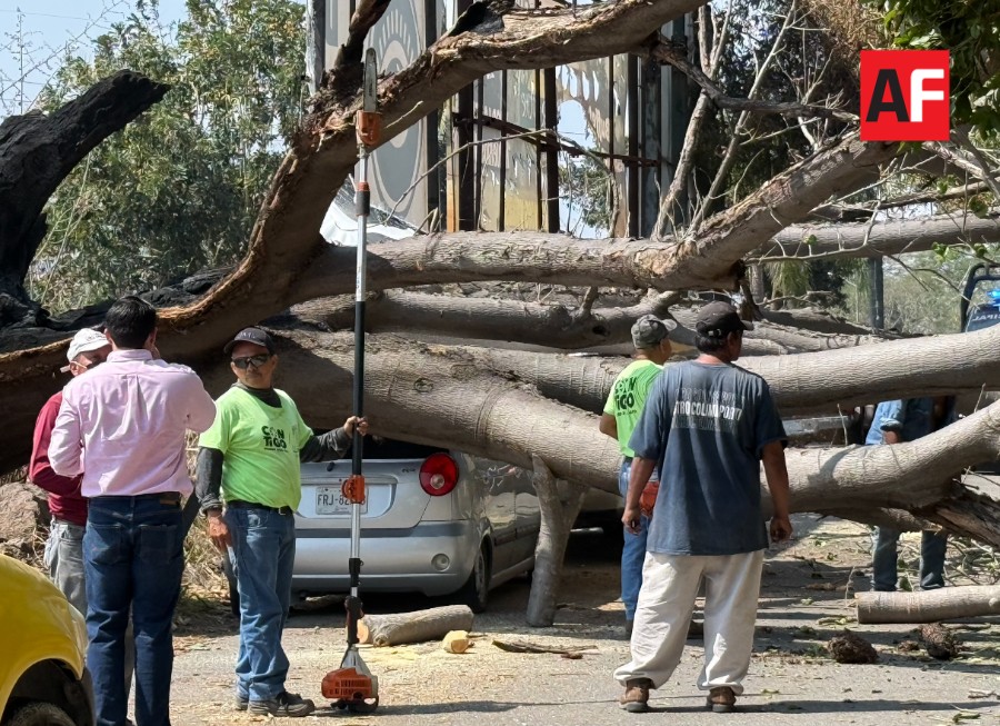 Colima.- Un árbol de más de siete metros de altura cayó sobre la vía pública en la zona norte de Colima, cerca del área de Zentralia, luego de que un incendio de maleza en un predio particular debilitara su tronco.