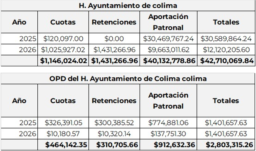 De acuerdo con información presentada en sesiones del Consejo de Administración del instituto, el adeudo total del municipio asciende a 104 millones 810 mil 940 pesos con 80 centavos.