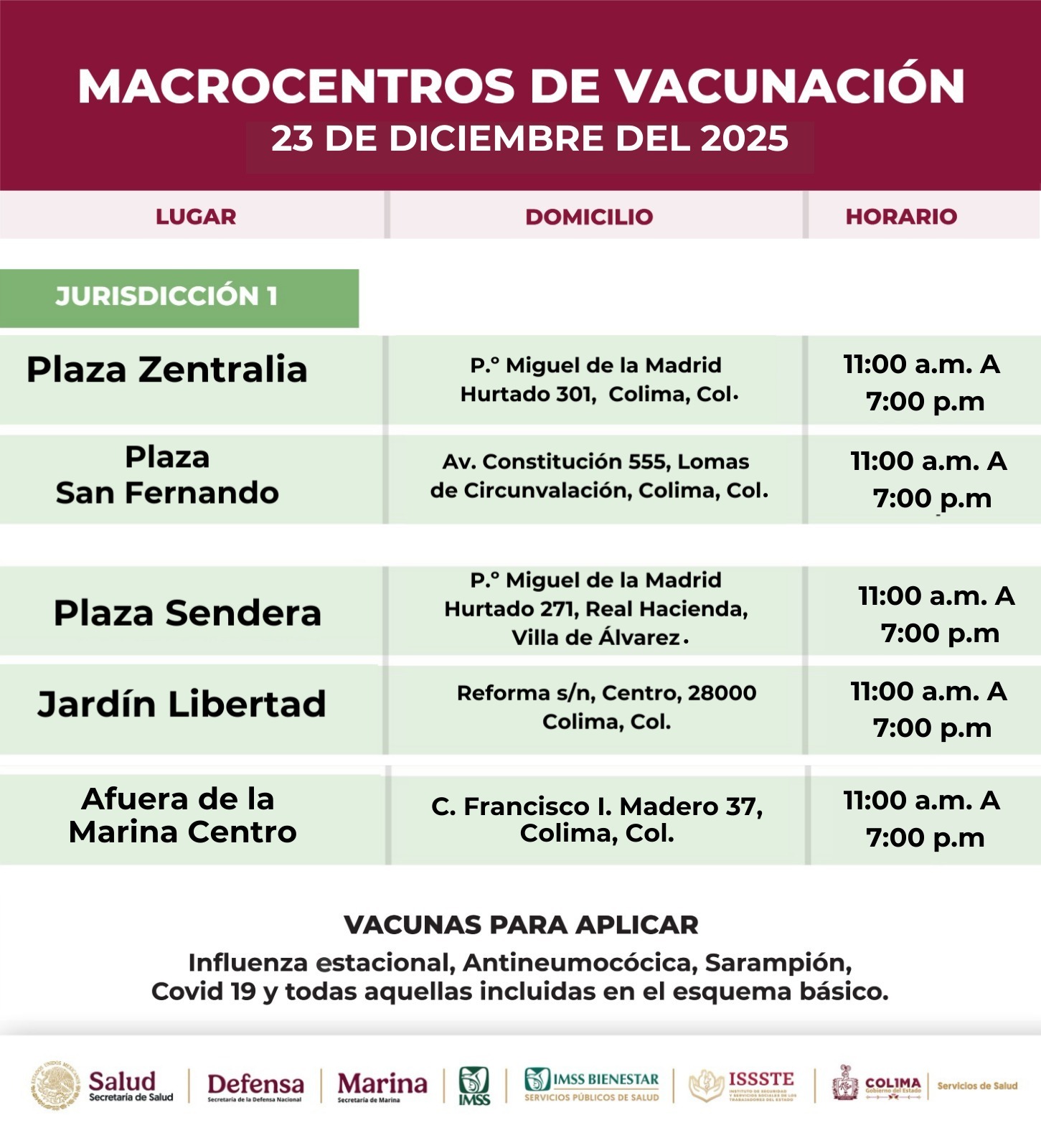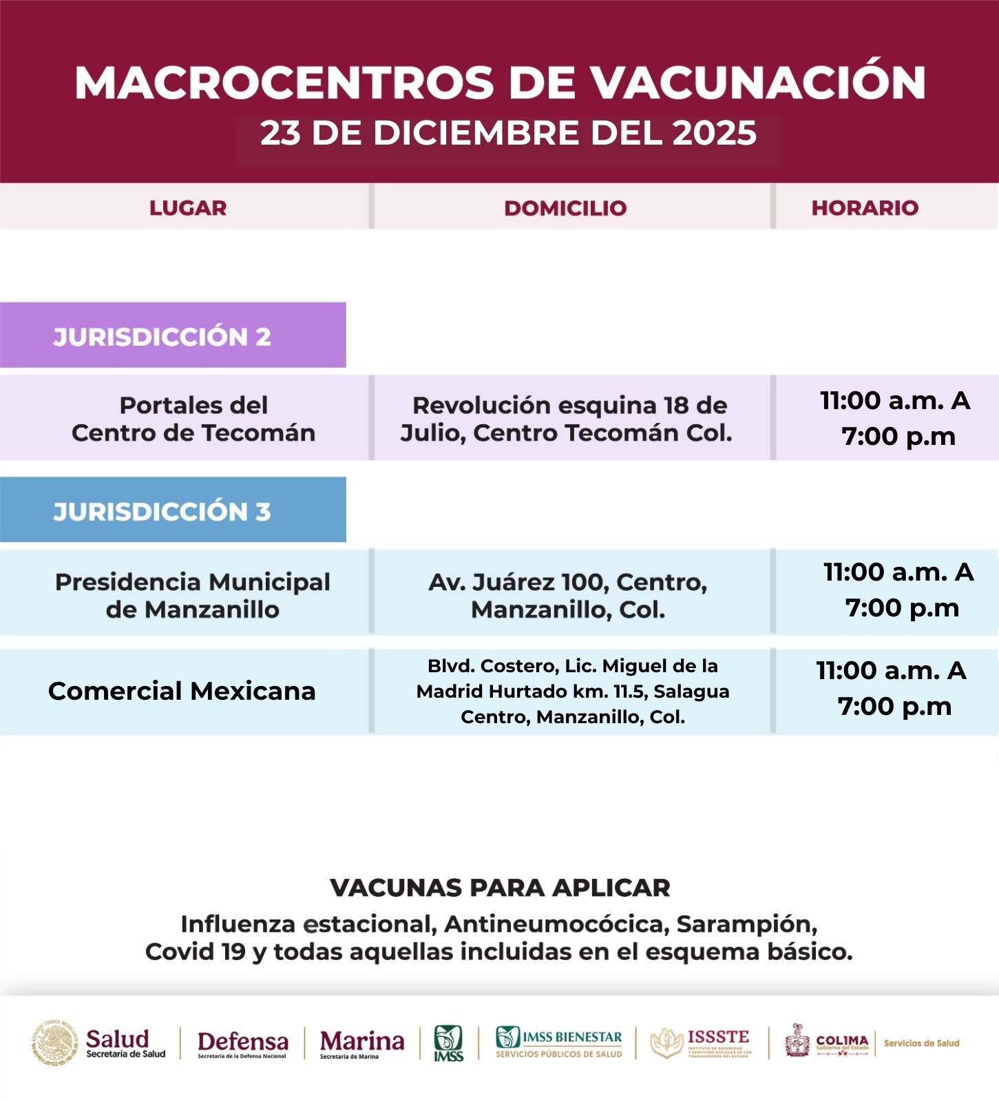 COLIMA.- La Secretaría de Salud del Gobierno del Estado de Colima informa que este martes 23 de diciembre lleva a cabo otra jornada más de vacunación en distintos puntos de la entidad, en horario de 11:00 de la mañana a 7:00 de la tarde, con la finalidad de acercar los servicios de salud a la ciudadanía y atender a la población que desea recibir las diferentes vacunas que se están aplicando.