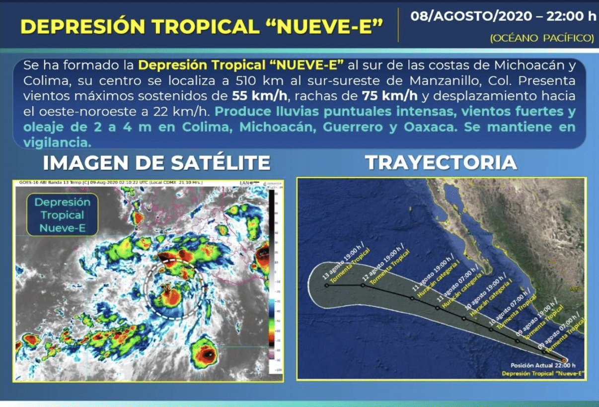 Colima.- Se ha formado la Depresión Tropical “NUEVE-E” al sur de las costas de Colima y Michoacán, presenta desplazamiento hacia el oeste-noroeste.