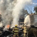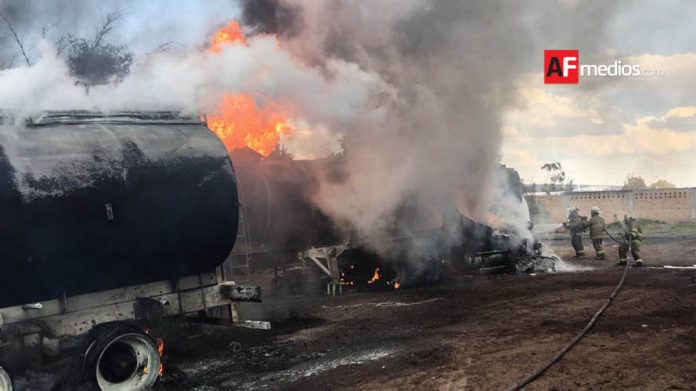 Jalisco.- Un Fuerte incendio se registró en un terreno donde se almacenaba gasolina, provocando que una pipa, una camioneta pick up y un auto compacto se incendiaran en el municipio de Tlajomulco, Jalisco.