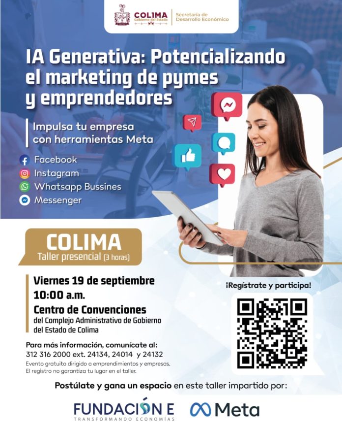 COLIMA.- Con el objetivo de fortalecer las capacidades digitales de las y los emprendedores y pequeñas empresas en la entidad, la Secretaría de Desarrollo Económico (Sedeco) del Gobierno del Estado de Colima, en coordinación con Fundación E y Meta, llevará a cabo el taller presencial gratuito ‘IA generativa: potencializando el marketing de pymes y emprendedores’.