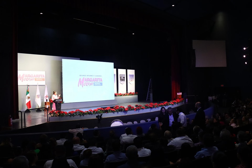 COLIMA.- “Han pasado dos años ya, de grandes retos pero también de grandes satisfacciones. Sigamos construyendo un municipio cimentado en la solidaridad y en la empatía, que fomente los valores, que defienda los derechos humanos y que cultive el respeto, para cosechar la armonía”, afirmó la presidenta Margarita Moreno, al dar a conocer su segundo informe de gobierno, en un evento que reunió familias, liderazgos ciudadanos, así como la clase política y sindical del estado en el Teatro Universitario.