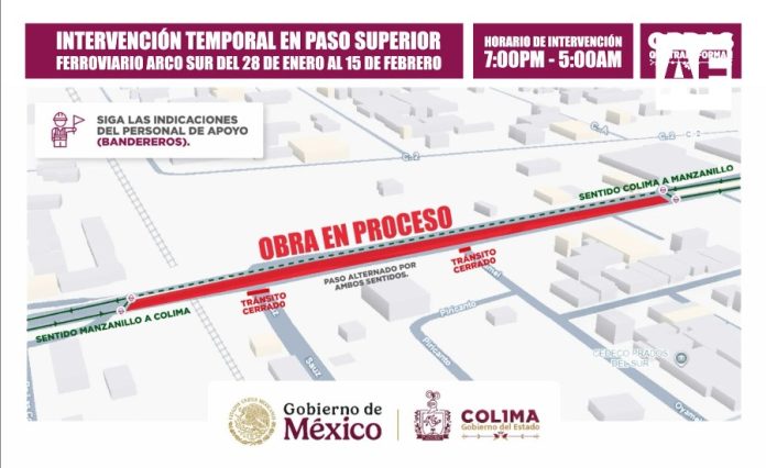 Colima.- La Secretaría de Infraestructura, Desarrollo Urbano y Movilidad (Seidum) del Gobierno del Estado de Colima informa que a partir de este miércoles 28 de enero y hasta el 15 de febrero, habrá cierres intermitentes en el área donde se construye el paso superior ferroviario ‘Arco Sur’, en un horario de las 7:00 de la tarde a las 5:00 de la mañana, a fin de que quienes circulan por esa zona contemplen esta situación y anticipen sus traslados, para evitar retardos o contratiempos.