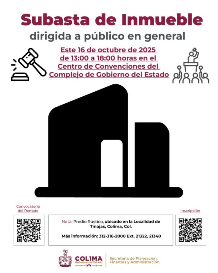 La Secretaria de Planeación, Finanzas y Administración (Seplafina) del Gobierno del Estado de Colima, informa que rematará un predio rústico ubicado en la localidad de Tinajas, municipio de Colima, correspondiente a la fracción 3 del predio rústico denominado El Rincón Largo, con una superficie de 39 hectáreas; el remate será el jueves 16 de octubre de 13:00 a 18:00 horas, en el Centro de Convenciones del Complejo Administrativo, en esta capital.