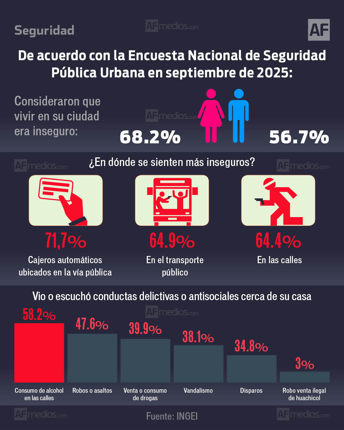El estudio, realizado en 91 áreas urbanas del país, revela que las mujeres (68.2 %) se sienten más inseguras que los hombres (56.7 %). Los espacios donde la población reporta mayor temor son los cajeros automáticos en la vía pública (71.7 %), el transporte público (64.9 %) y las calles que habitualmente transitan (64.4 %).