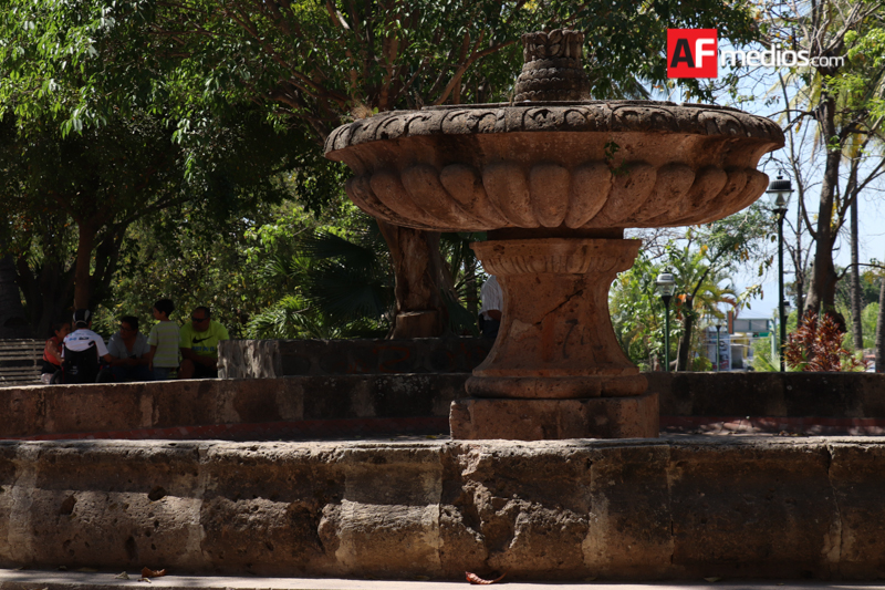 Colima.- La fuente central del jardín de San Francisco, muestra el deterioro del paso del tiempo, pero también del daño que algunos ciudadanos hacen en este tipo de construcciones públicas, como es el caso del grafitti.