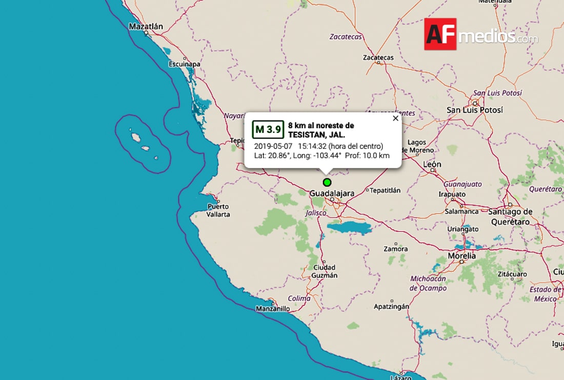 Jalisco.- El Servicio Sismológico Nacional reportó a las 15:14 horas un sismo de magnitud 3.9 con epicentro a 8 kilómetros al noreste de Tesistán, Jalisco a 10 kilómetros de profundidad.