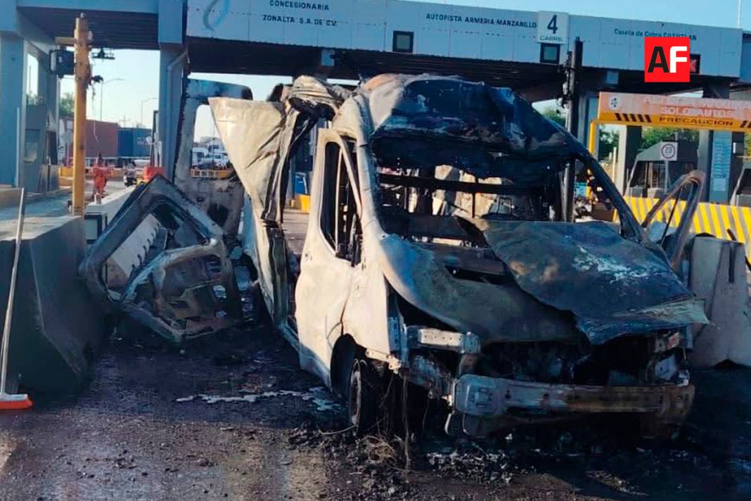 Colima, Colima.- 4 de diciembre de 2025.- Una ambulancia del IMSS se incendió este miércoles en la caseta de cobro de Cuyutlán, sobre la autopista Colima–Manzanillo, luego de que se activara de manera súbita el sistema de bloqueo del carril de peaje.