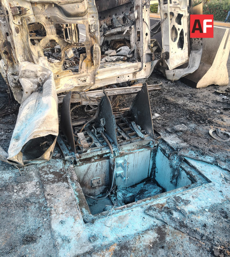 Las imágenes en poder de este medio muestran la base metálica del sistema que se elevó y perforó la parte inferior de la ambulancia, rompiendo el tanque de gasolina, lo que derivó en una fuga inmediata y, segundos después, en el incendio que consumió casi por completo el vehículo de emergencias.