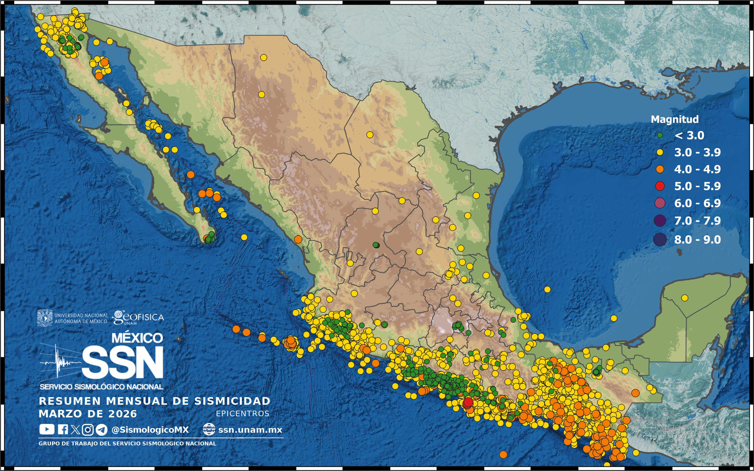 CDMX.- Durante el mes de marzo de 2026, el Servicio Sismológico Nacional reportó 3 mil 162 temblores con epicentros dentro del territorio mexicano. Las magnitudes van de 1.0 a 5.2. La distribución de los epicentros se concentró principalmente en los estados de Chiapas, Oaxaca, Guerrero, Michoacán, Colima y Jalisco, así como en el Istmo de Tehuantepec y en el Golfo de California.