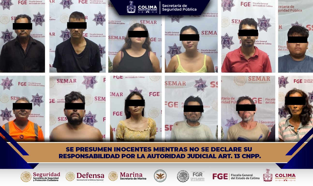 COLIMA.- Como resultado de un operativo coordinado entre autoridades federales, estatales y municipales, la Secretaría de Seguridad Pública (SSP) del Gobierno del Estado de Colima logró la detención de doce personas en distintos puntos de los municipios de Manzanillo, Colima y Tecomán, por su presunta participación en delitos contra la salud.