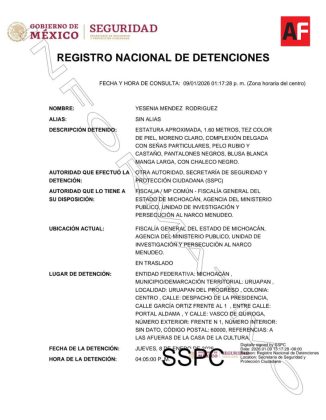 Uruapan, Mich.- Viernes 09 de enero de 2026.- A través del Registro Nacional de Detenciones, difundido por el Gobierno de México y la Secretaría de Seguridad y Protección Ciudadana (SSPC), se dio a conocer la detención de Yesenia N, secretaria particular de Carlos Manzo y Grecia Quiroz.