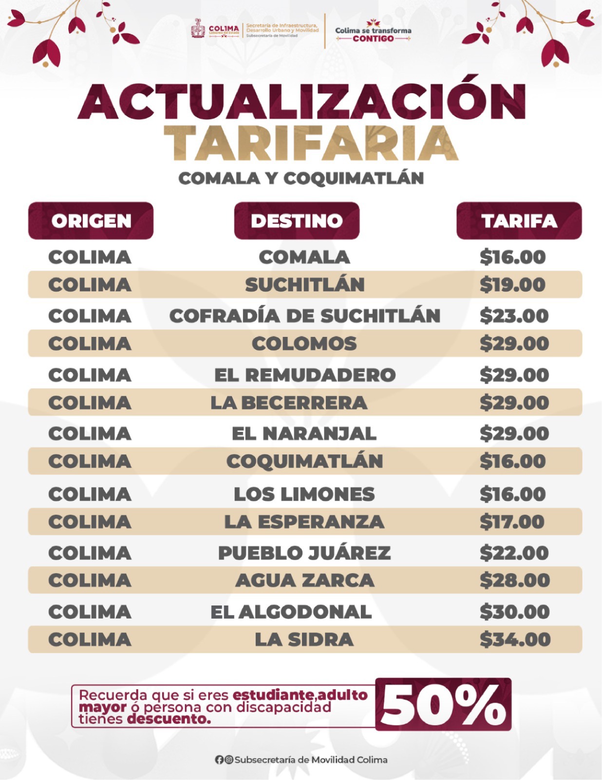COLIMA.- La Subsecretaría de Movilidad (Subsemov) del Gobierno del Estado de Colima dio a conocer en conferencia de prensa acciones prioritarias de su agenda operativa, así como la actualización tarifaria que se informa en gráfico anexo, además del estatus de trámites vehiculares.