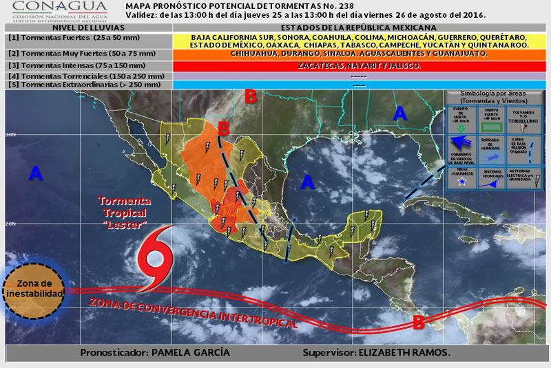 Lo anterior debido a un canal de baja presión se mantendrá sobre el interior del país, provocará potencial de tormentas puntuales muy fuertes en Chihuahua, Durango y Sinaloa; tormentas puntuales fuertes en Sonora, Nayarit, Jalisco, Colima, Michoacán y Guerrero.