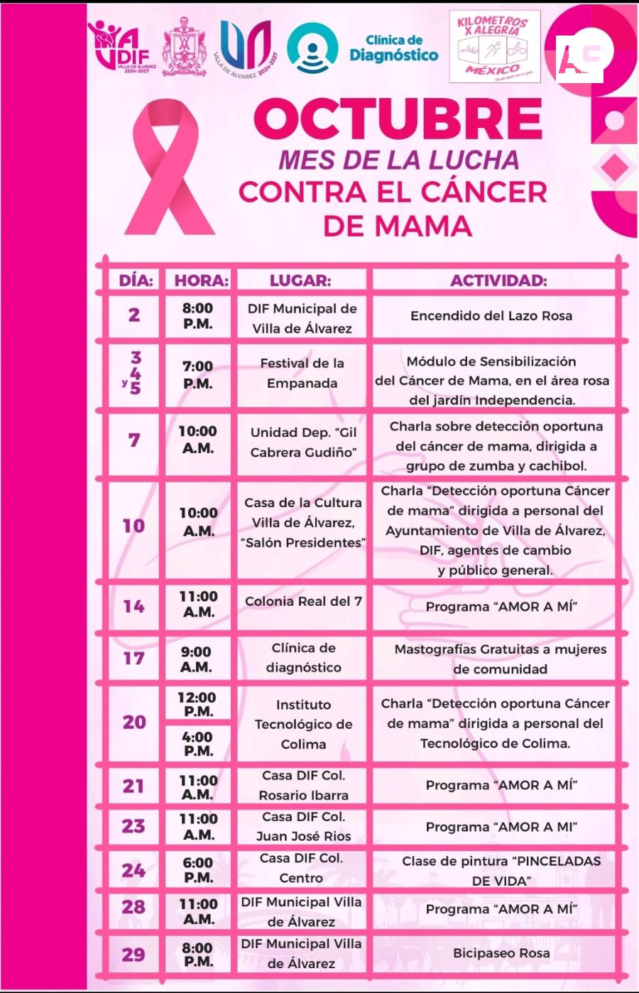 Martha Yadira Martínez, Directora del DIF Villa de Álvarez, desplegó la Agenda Rosa para octubre, que iniciará el días dos a las 8 de la noche con el encendido del Lazo Rosa en el exterior del DIF y en la explanada de la Diana Cazadora, y concluirá el 29 de octubre con el Bicipaseo Rosa, en las que además habrá charlas sobre la concientización e importancia de la detección oportuna del cáncer de mama.