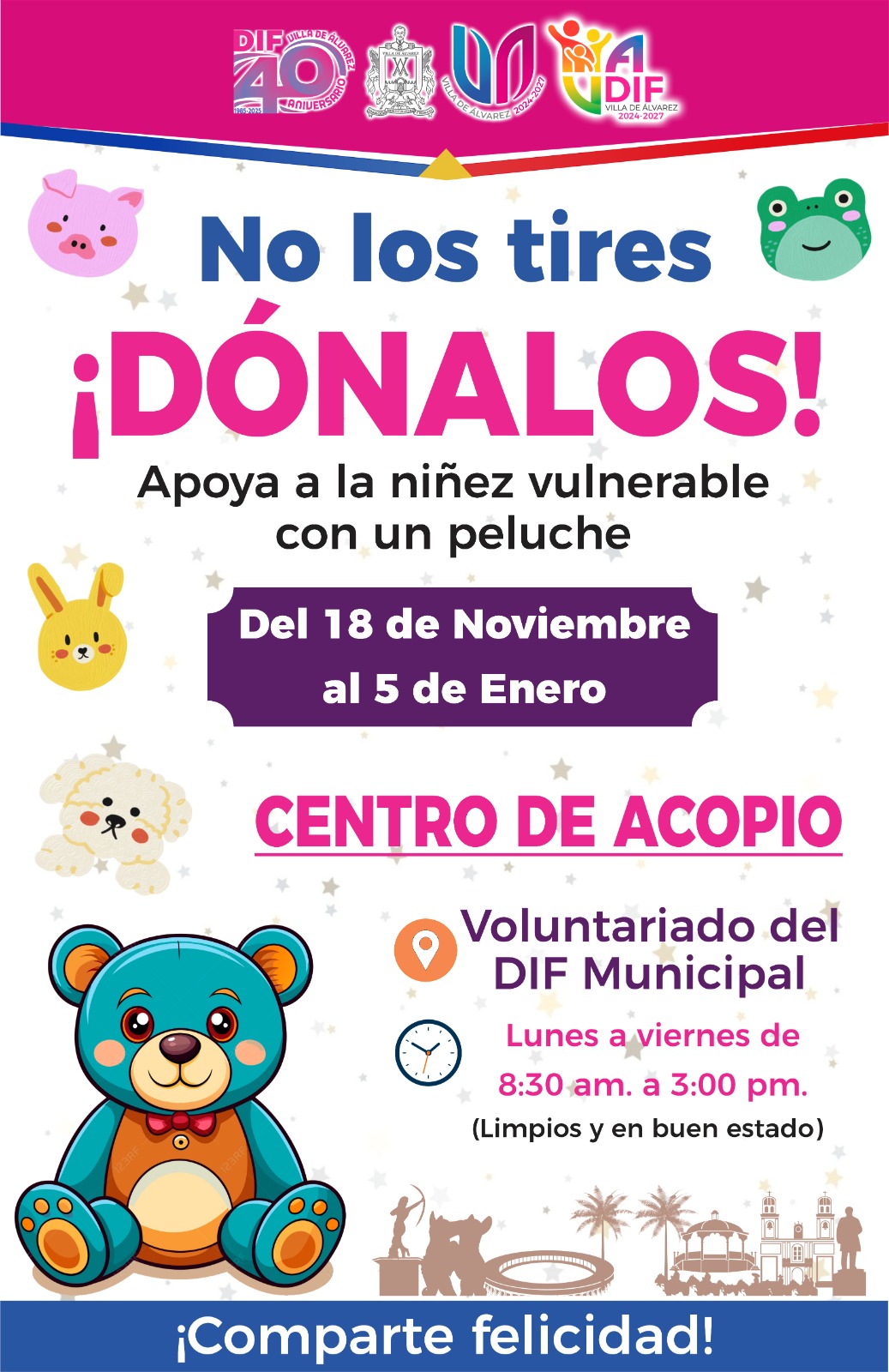 Martha Yadira Martínez, Directora del DIF Municipal, explicó que la campaña Dona un Juguete recibirá juguetes nuevos o usados en buen estado, que funcionen sin necesidad de baterías y no sean violentos; No los Tires Dónalos, es para colectar muñecos de peluche; mientras Abrigando Corazones es de cobertores, chamarras y ropa abrigadora nueva o usada en buenas condiciones.