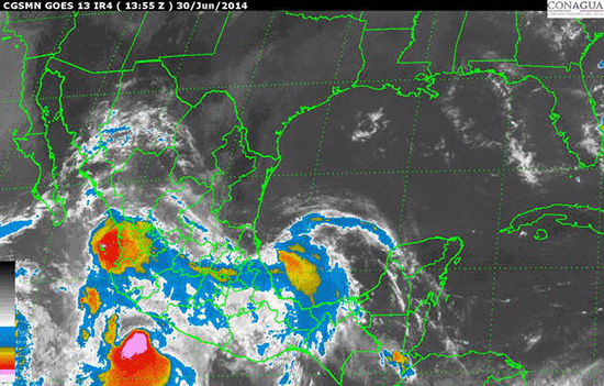 Además, podrían registrarse rachas de viento de 45 km/hr y oleaje de 3 a 4 metros de altura en las costas de Jalisco, Colima Michoacán y Guerrero.