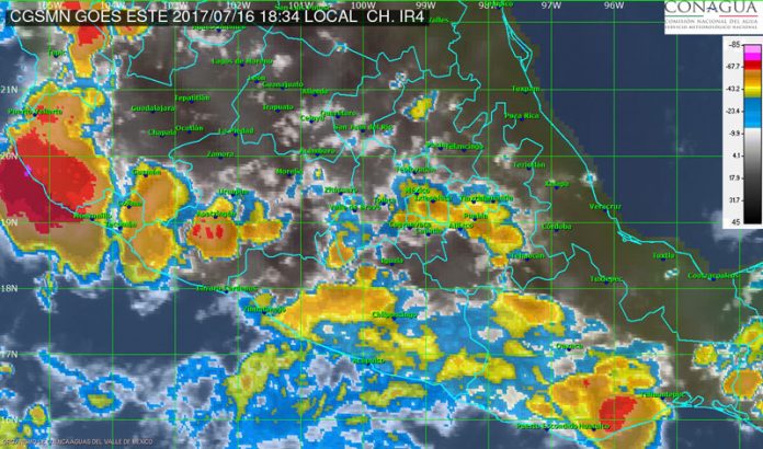 El Servicio Meteorológico Nacional (SMN) establece que durante esta noche, se mantienen tormentas puntuales muy fuertes con actividad eléctrica en Sonora, Chihuahua, Nayarit, Jalisco, Colima, Michoacán y Chiapas; así como puntuales fuertes en Durango, Sinaloa, Zacatecas, Aguascalientes, Guanajuato, Guerrero, Estado de México, Morelos, Puebla, Veracruz, Oaxaca, Tabasco, Campeche, Yucatán y Quintana Roo, además de chubascos intermitentes en el resto del territorio.