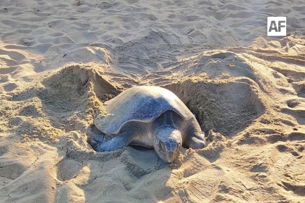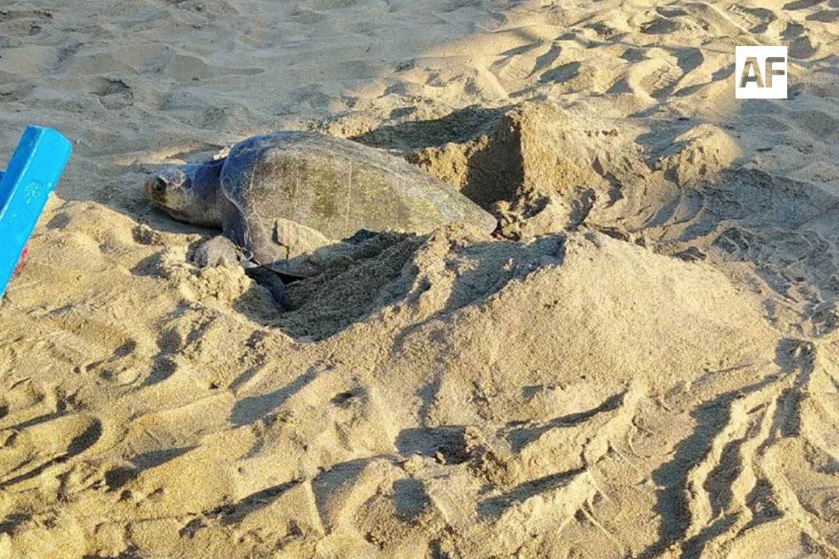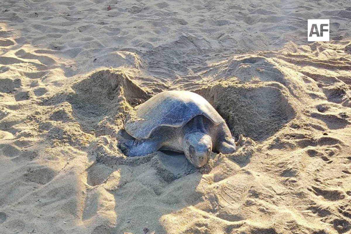MANZANILLO.- Ante la sorpresa de los visitantes, una tortuga arribó a desovar en la playa Miramar Peñitas, en la zona norte de Manzanillo, la mañana de este miércoles 1 de abril.