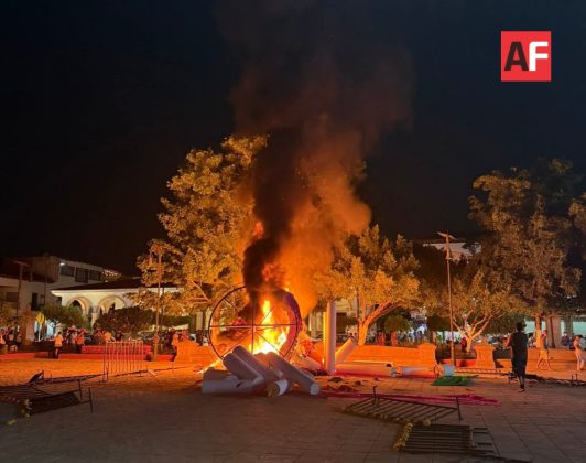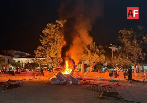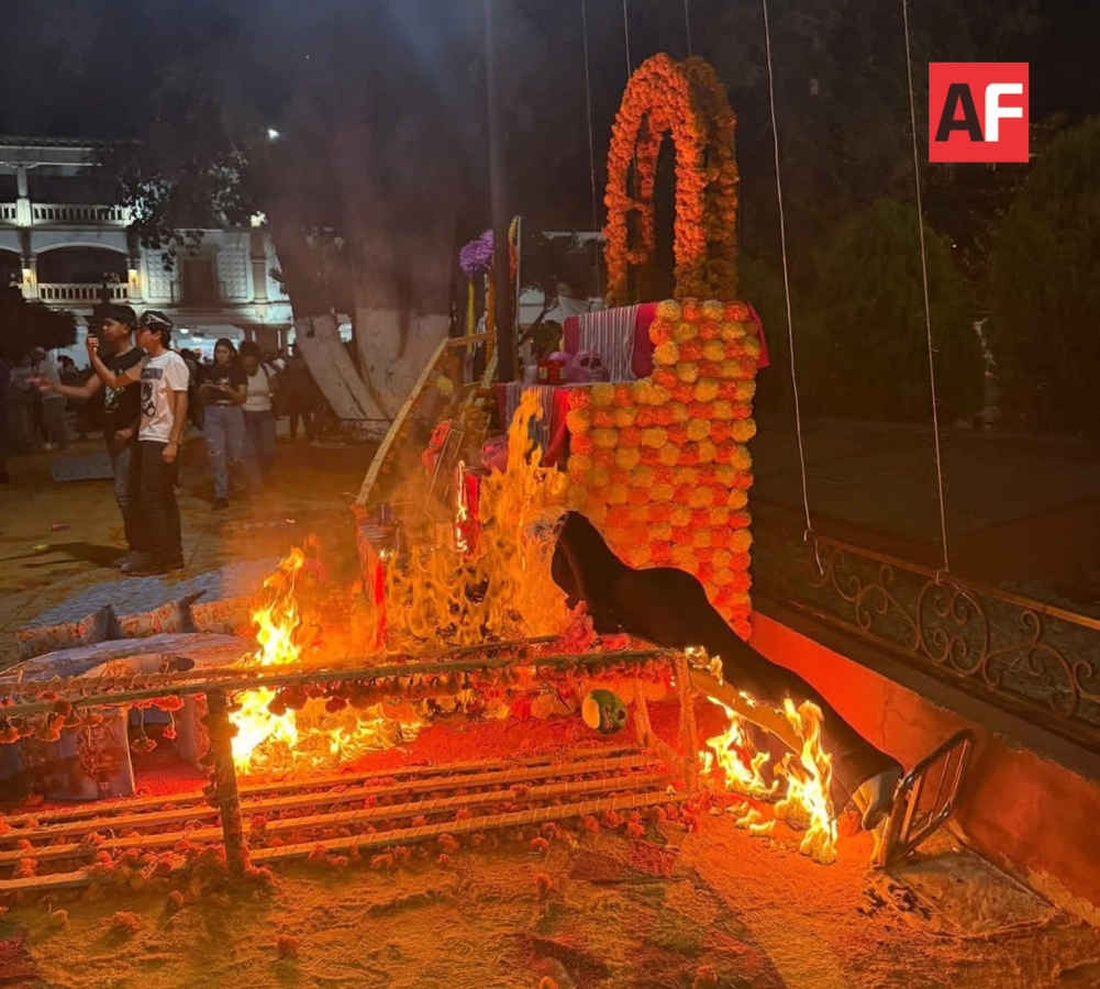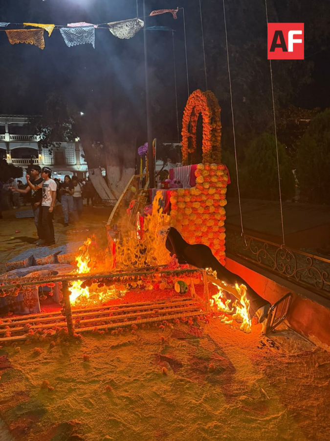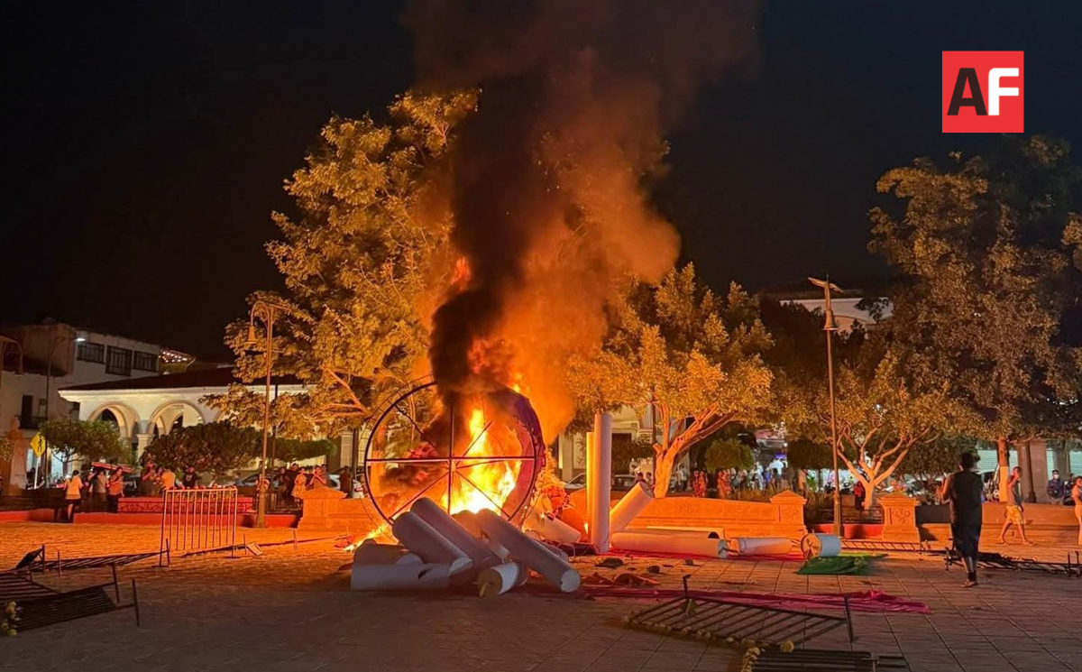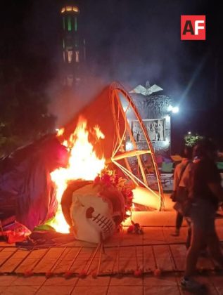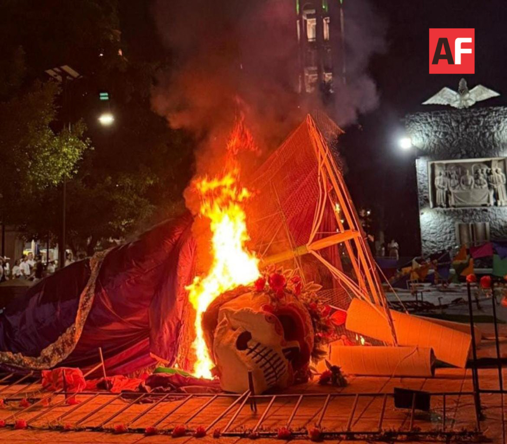 La violencia también alcanzó la Plaza Constituyentes, donde fueron vandalizados altares y ofrendas del Día de Muertos. Bomberos y paramédicos acudieron al sitio, pero los manifestantes les impidieron intervenir hasta que elementos de la Guardia Civil restablecieron el orden y permitieron controlar el fuego.